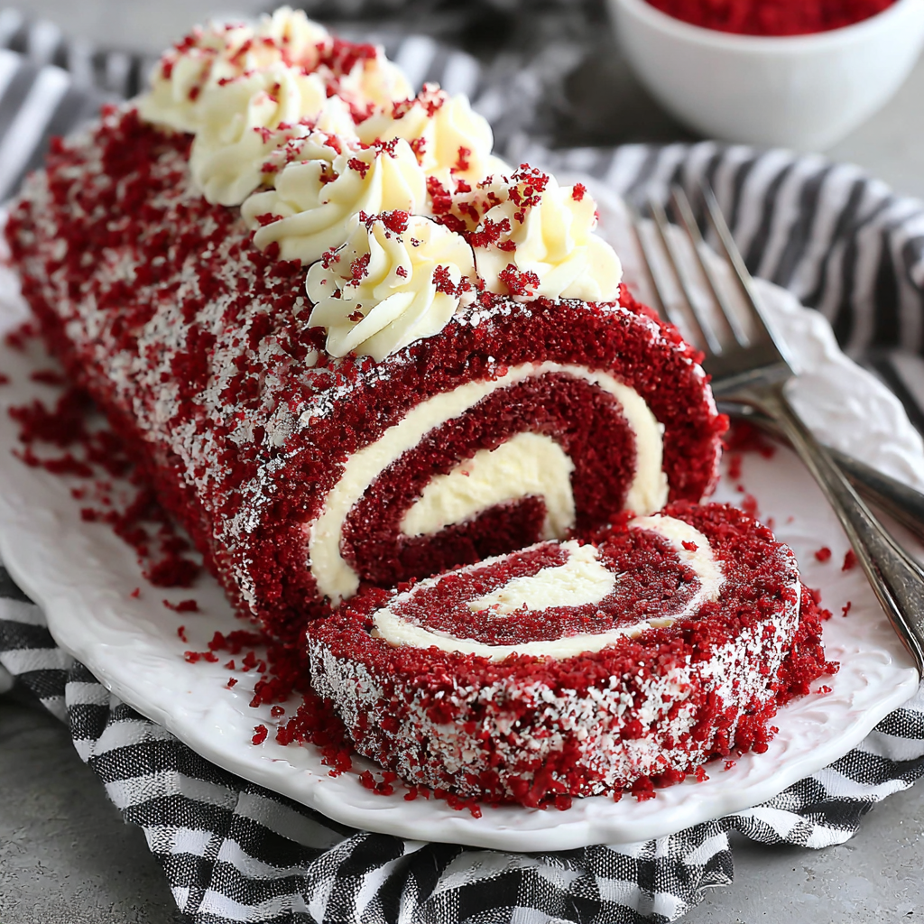 This RED VELVET CAKE ROLL features a soft, velvety texture and a rich chocolate flavor...