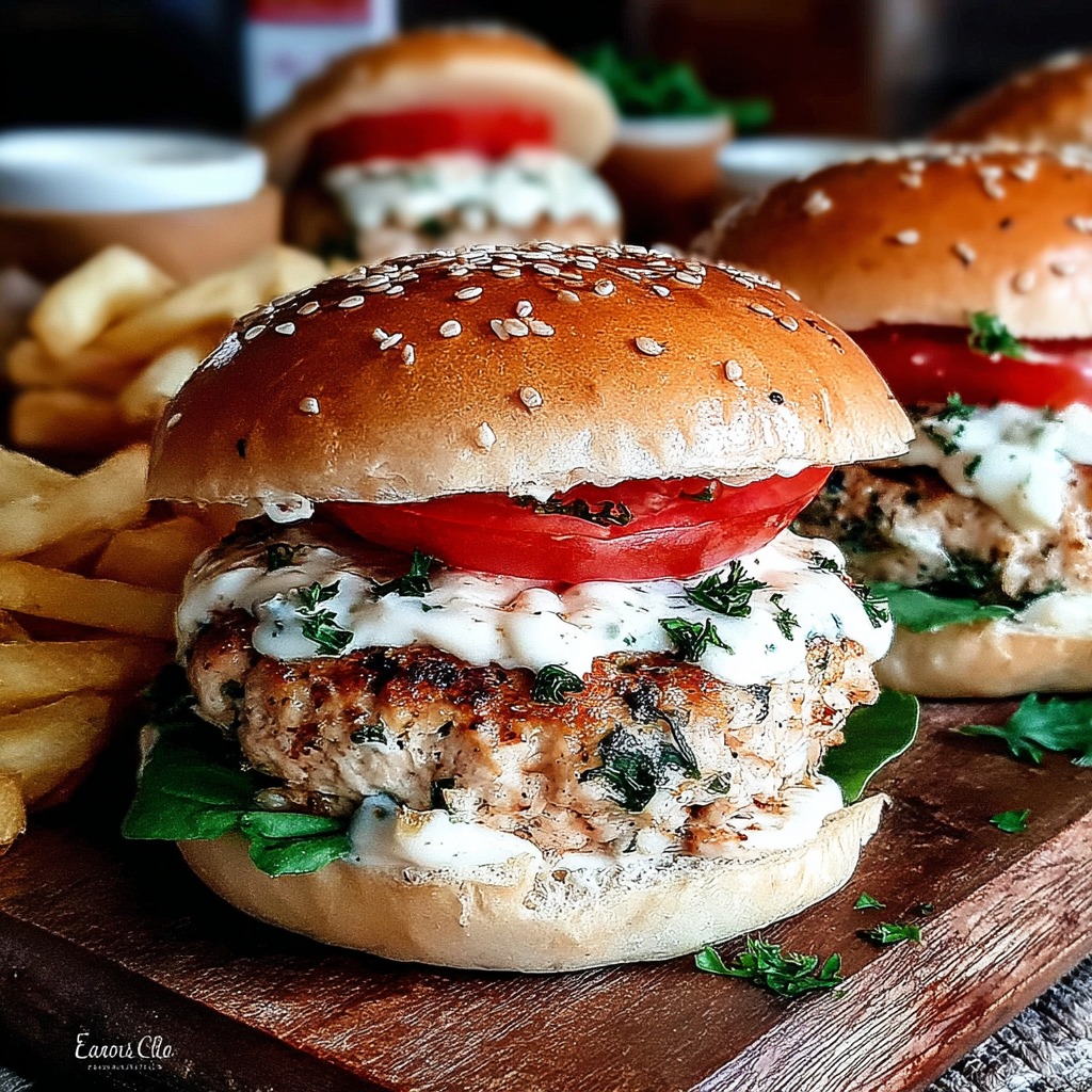 Juicy Greek Chicken Burgers burst with zesty herbs and spices, creating a mouthwatering blend of...